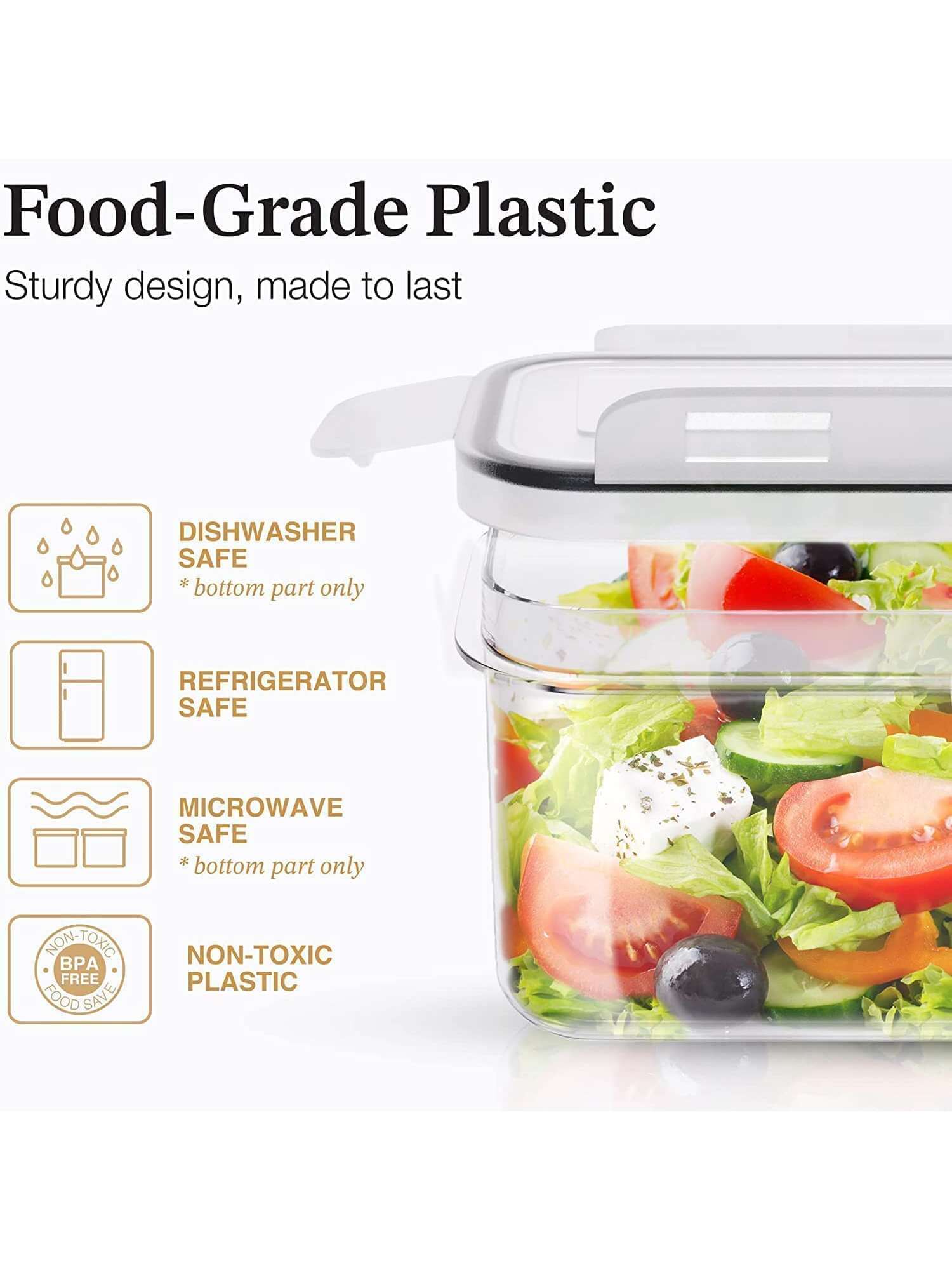 Premium Quality: Engineered with food-grade, BPA-free materials, our containers prioritize safety and durability, ensuring your peace of mind with every use. Designed to withstand the rigors of daily kitchen activities, these containers are dishwasher safe, microwave safe, and freezer safe, offering unparalleled convenience and versatility.